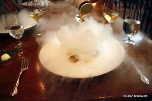 Next came the WOW factor! Our third course was a Cold “Smoked” Niman Ranch Lamb with Fuji Apple and Curry Dressing. After the plates were placed on the table, liquid nitrogen was poured over top to create the cold “smoke” in the dish, which was quite impressive.