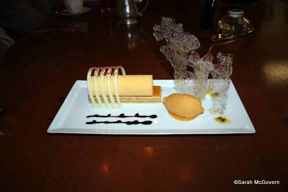 Next was the first of our two dessert courses. Yes I said TWO dessert courses! This was a Tropical Summer Fruit Pave, which they have nicknamed the “Monorail Dessert.” You can see why from the photo. It was a crisp, refreshing dessert with flavors of passion fruit, guava and white chocolate, served with a sweet dessert wine. It was beautifully presented with a colorful sugar display.