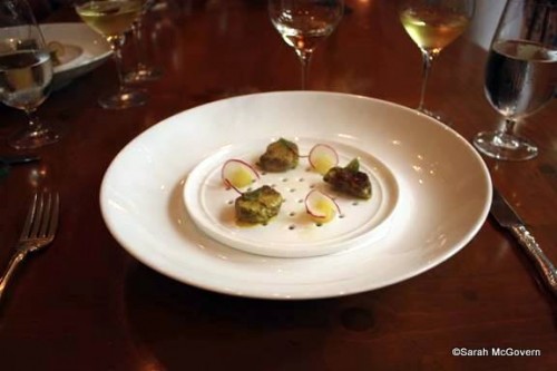 The flavor of sage was predominant, which was a nice complement to the earthy flavors of the next course, a Poulet Rouge with Mushroom-Truffle Ragout and Yellow Chanterelles. Poulet Rouge is a Heritage breed chicken brought to the United States from France and is currently raised in North Carolina. It is rich in flavor and much more tender then the chicken found in a local grocery store. This dish was served with a Pinot Noir to go nicely with the deep woodsy flavor of the truffles. Truffles…simply AMAZING.