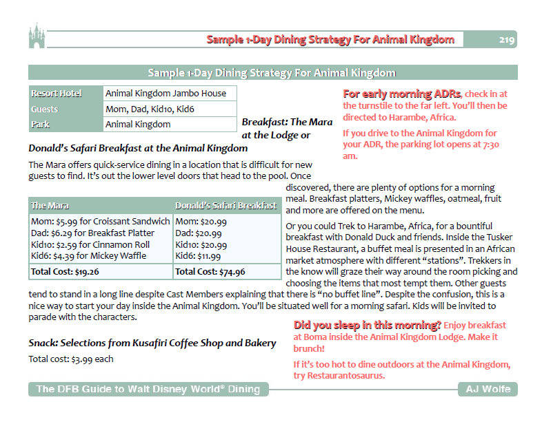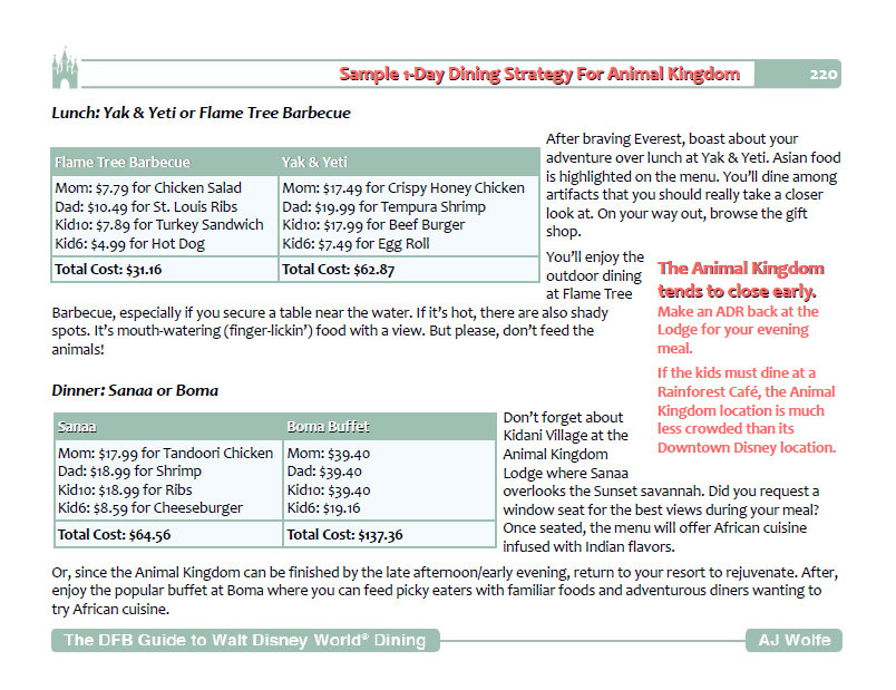 We got several responses similar to this one, and since we often plan our dining to be close and convenient to where we’ll be that day, too, we thought it was a great idea. So we included in the DFB Guide several one-day dining strategies for specific circumstances (see a sample dining strategy below for guests staying at the Animal Kingdom Lodge).