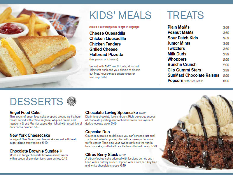 Menu items begin at $6.59-8.99 for appetizers and adult entrees from $8.59-11.99. See updated pricing at AMC Theater Fork and Screen site and visit the Downtown Disney 24 link.