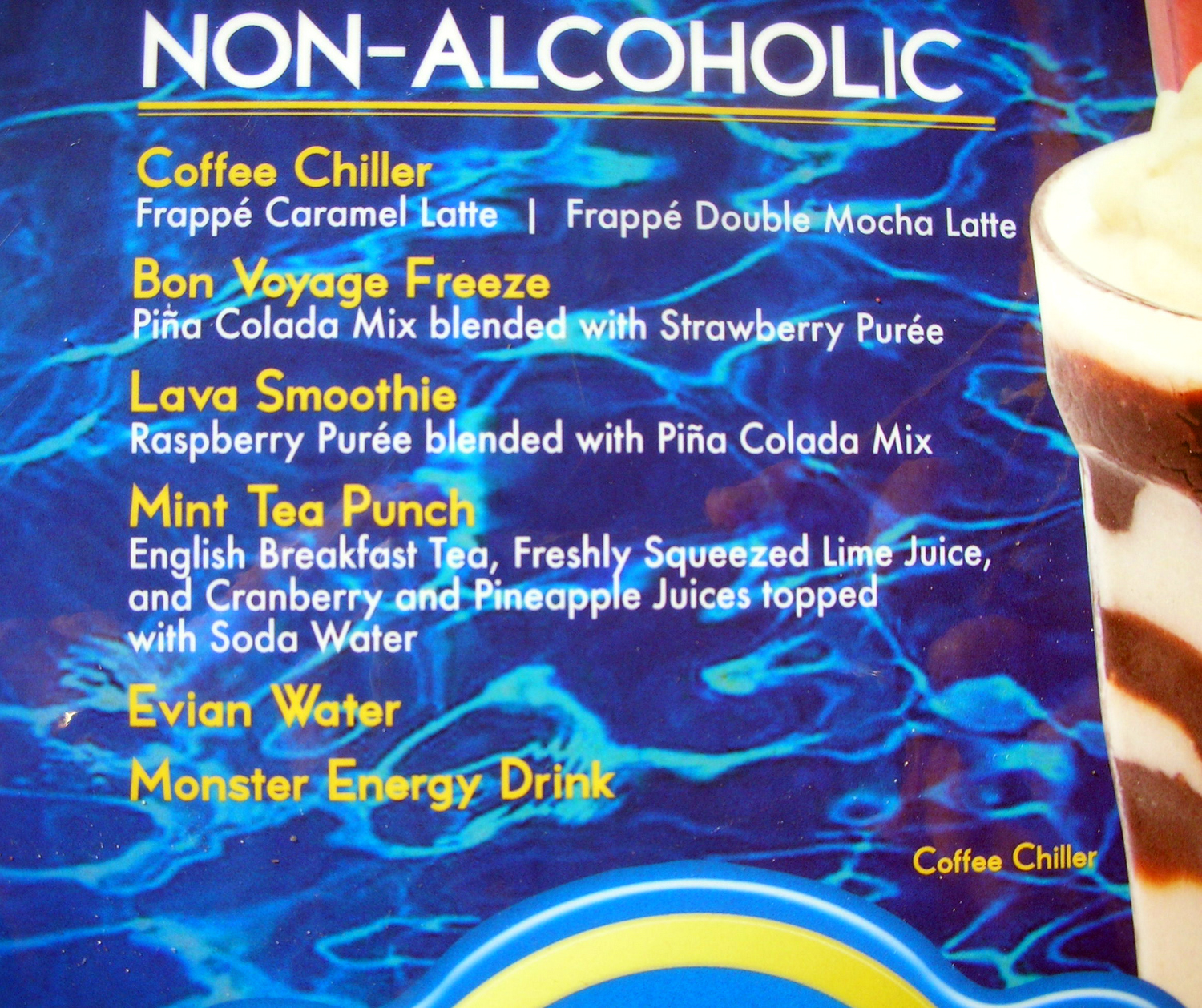 Fortunately, if you are cruising on the Disney Dream, these woes are a thing of the past! Non-alcoholic specialty drinks abound! With descriptive and whimsical names such as the Passion Cream Freeze (orange passion fruit juice, vanilla ice cream, grenadine) or Parrot Song (banana, coconut cream, pineapple juice), I was thrilled at the wide variety of choices! Just about every bar or lounge had it’s own special non-alcoholic drink, and some even had several.