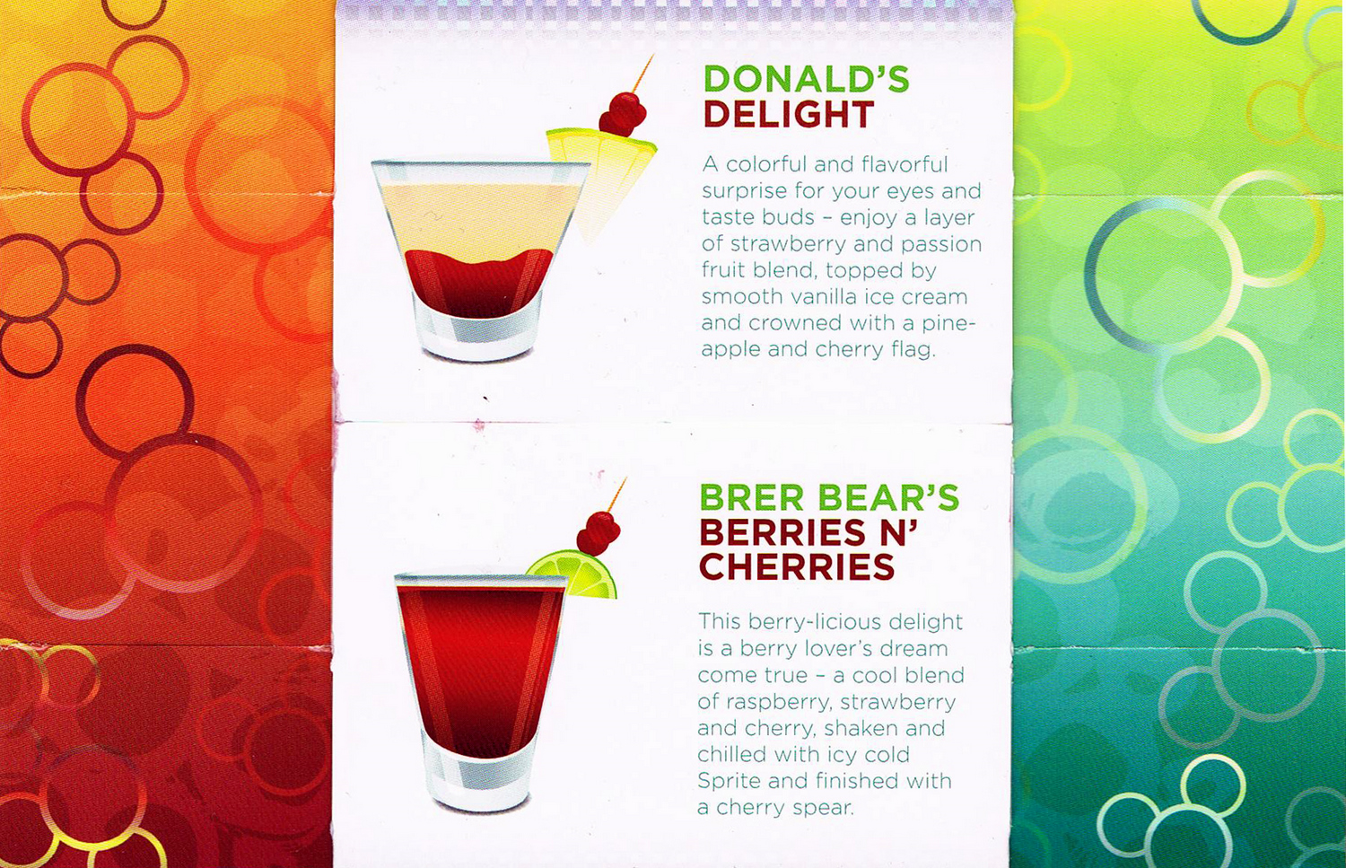 What appeared to be an index card unfolds to reveal a picture of 2 drinks with descriptions. Continuing to unfold the card reveals more sets of drinks. These “Mocktails for Little Disney Dreamers” were made with as much care as any alcoholic cocktail, and each was a visual delight as well as a party for your taste buds.