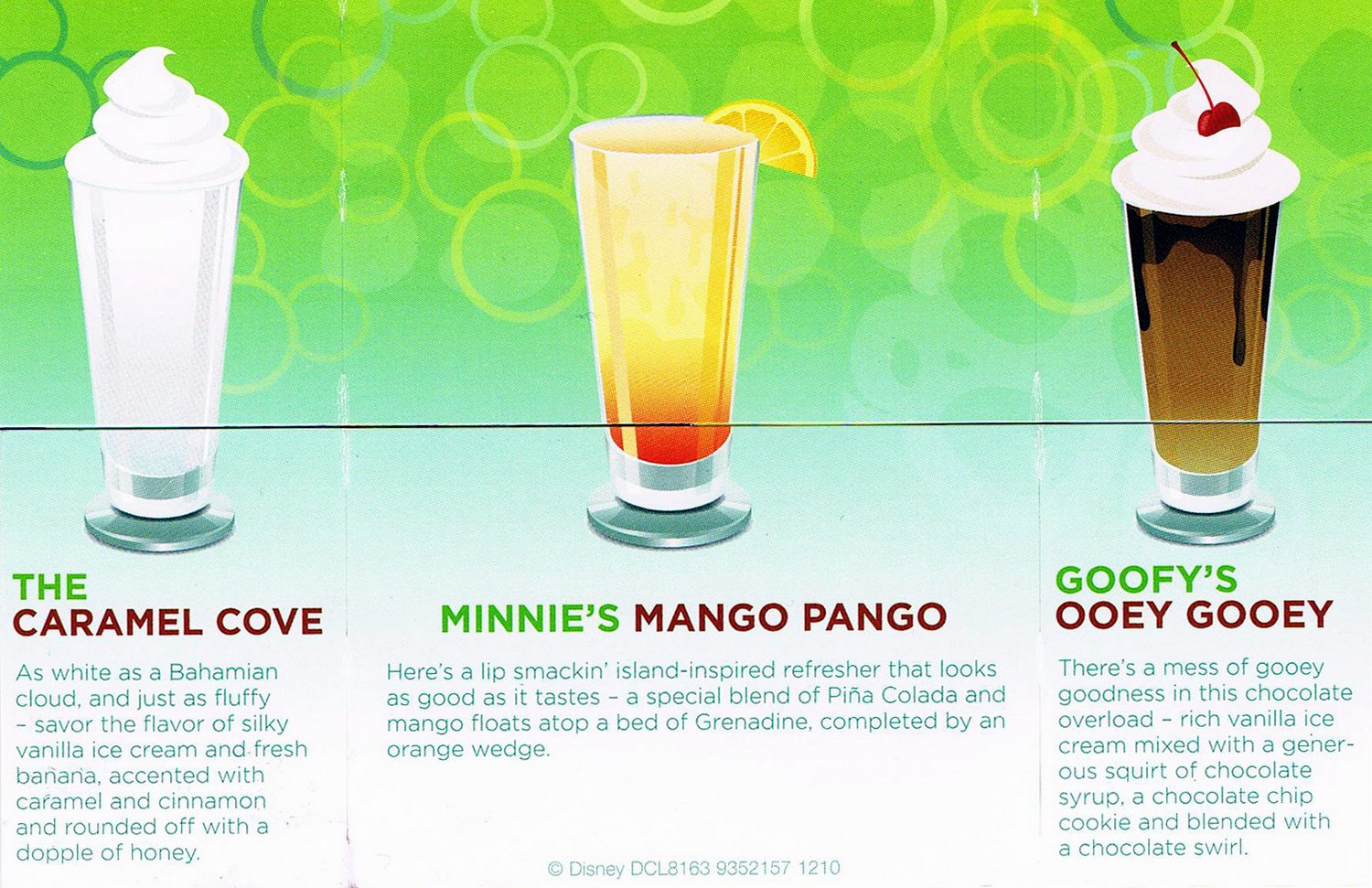 While my finances did not allow me to sample every drink on my 4-night cruise, I did manage to order 8 different drinks. The Bon Voyage Freeze, Lava Smoothie, Bora Shake, Princess Delight, Northern Garden, Passion Cream Freeze, Brer Bear’s Berries N’ Cherries, and Goofy’s Ooey Gooey all contributed to the 6 lbs I gained on the cruise. Here are my top three: