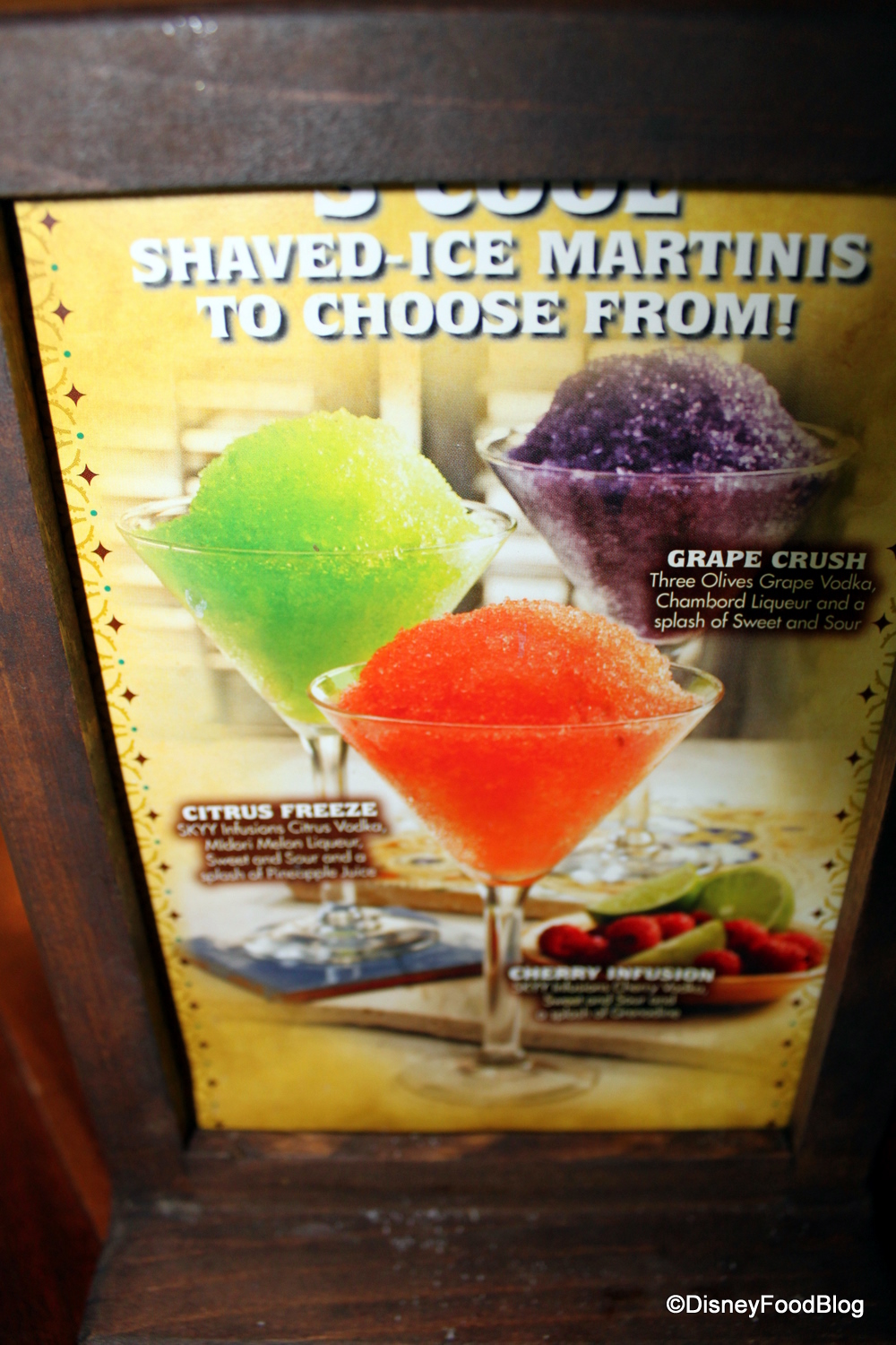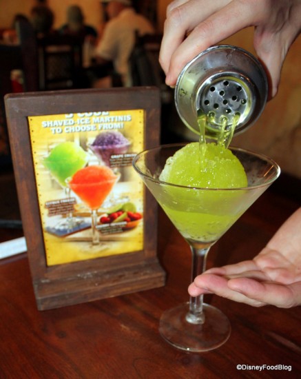 The Shaved Ice Martinis were new on the scene at that time, and I after careful deliberation, I chose the citrus version. It was delicious — very tangy with Citrus Vodka, Midori, Sweet and Sour, and Pineapple Juice. (C’mon, Disney; more of these great drink introductions around the World, please! :-D)