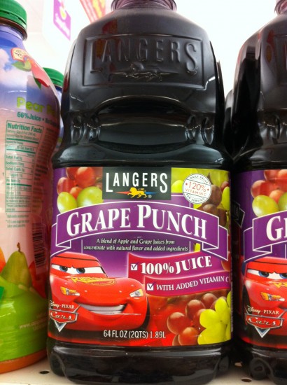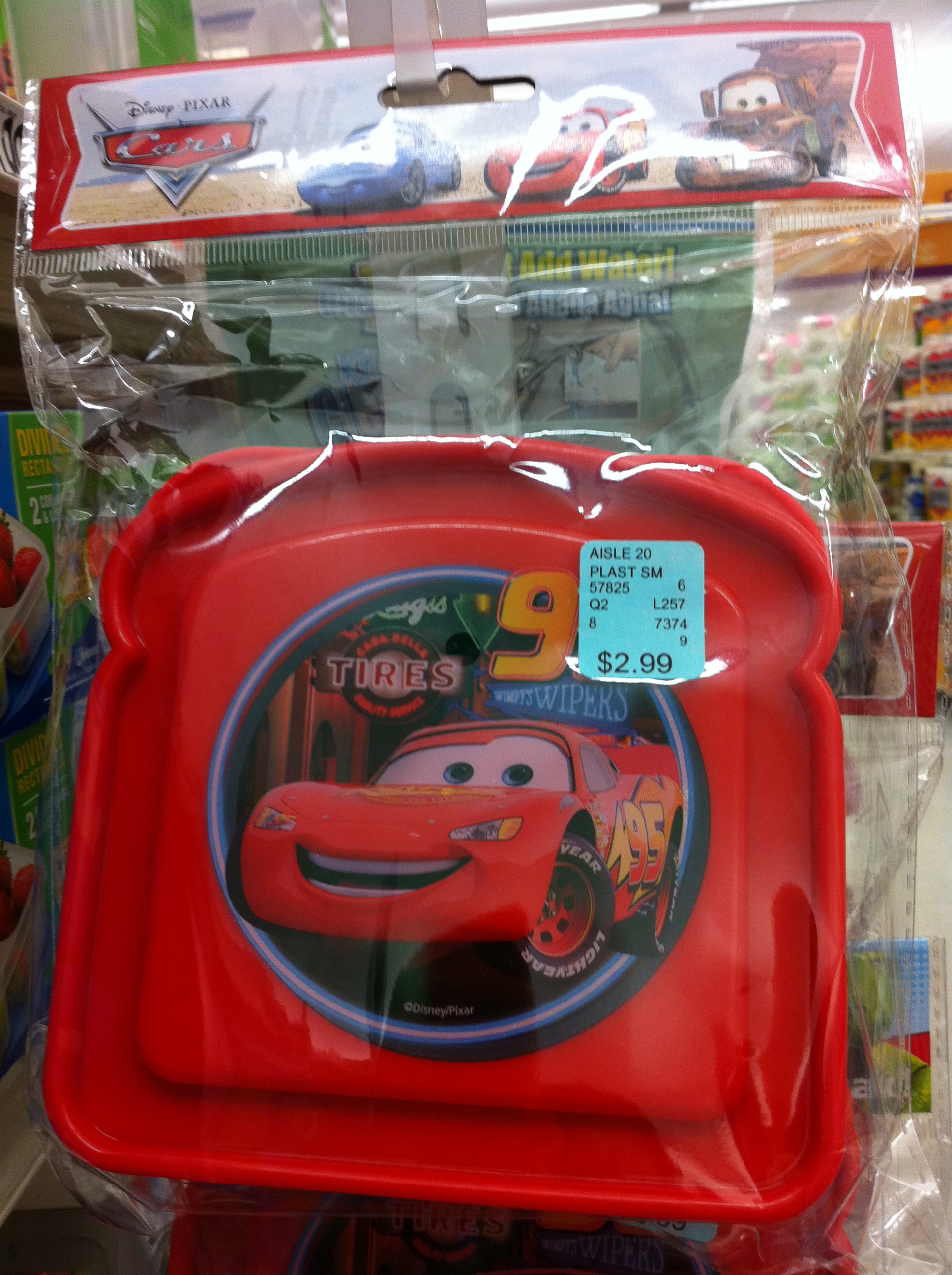 I enjoyed seeing all the Cars toys out for display that day, and reeeeally enjoyed seeing Sir Michael Caine and Emily Mortimer briefly discuss their roles in the film, but Klaseus’ remarks “about more branded products than ever” didn’t make much of an impression on me. Until I took a trip to Target this week – Cars 2 merchandise was EVERYWHERE – not only toys, but also vitamins,Band-aids, towels, pillows, batteries, wall hangings, party supplies, roller blades, bike helmets, tissues, diapers, clothing, books, and, of course, food.