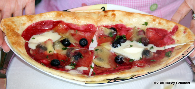 I must admit, the pizza didn’t live up to my hopes since the last time I was at Palo when I had a sweet pizza made with raspberry sauce that was topped with mango shavings, blueberries and Marscapone cheese (see below). I was sad not to see that one this trip. There was a grape and Gargonzola offering, but that would have been cheating on my favorite.