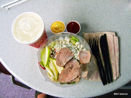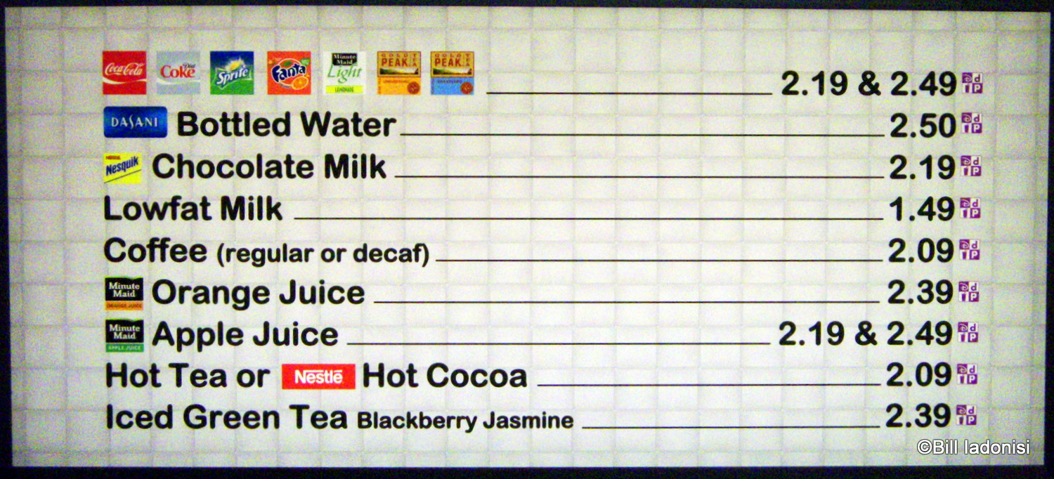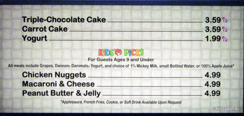 For dessert, you can have yogurt ($1.99) or a choice of a Carrot Cake or Triple-Chocolate Cake ($3.59). Standard counter-service beverages are available…water, low-fat milk, chocolate milk, soda, coffee, juices (apple and orange), hot tea or cocoa and blackberry jasmine iced green tea.