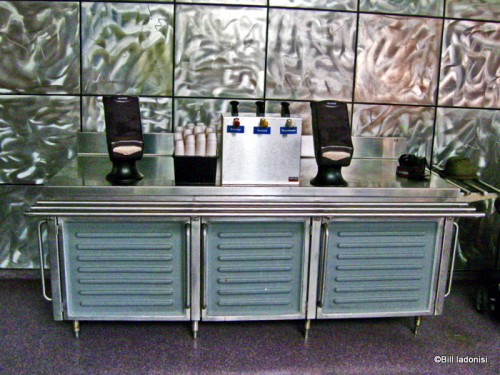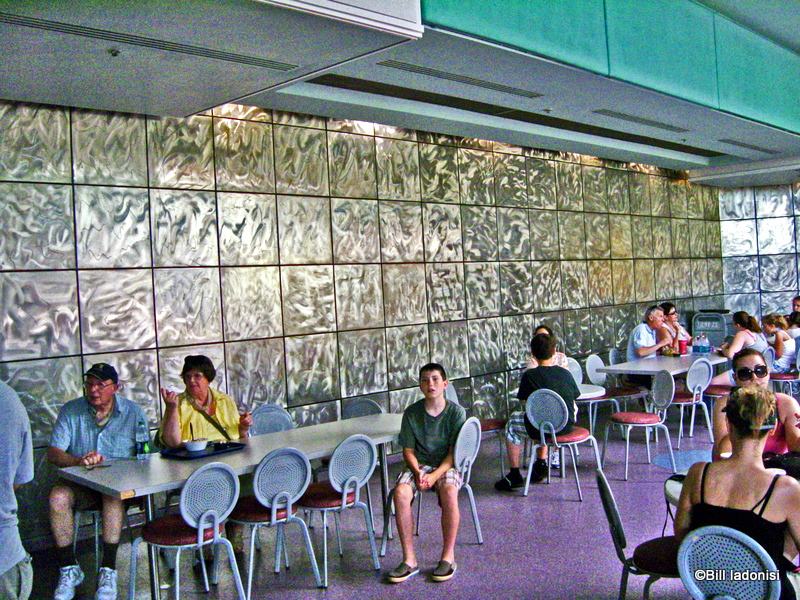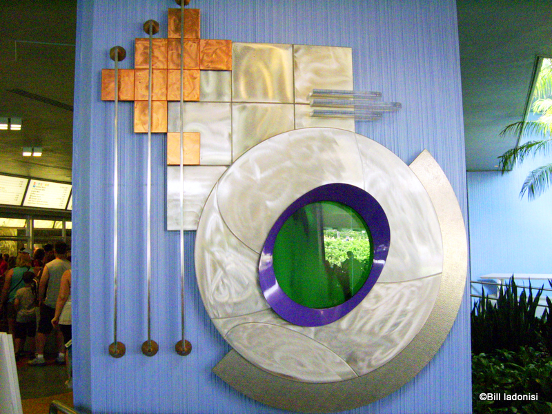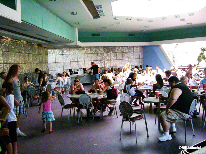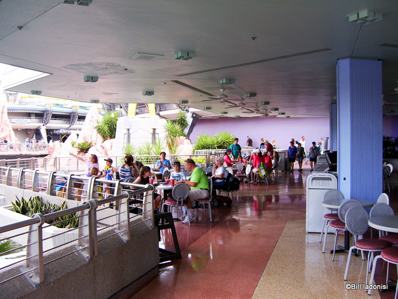 The walkway goes right through the restaurant, giving access from Main Street and Tomorrowland. The décor is futuristic in concept, with diamond overhead lights, stainless steel railings, and polished stainless steel plates on the walls of the upper dining area.
