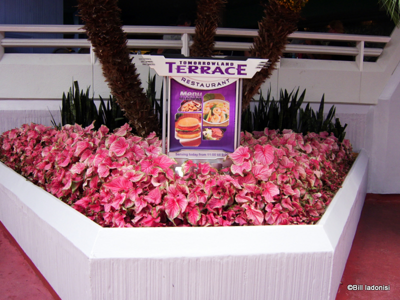 The restaurant is conveniently located between the Plaza Restaurant and Laugh Floor Comedy club on the side walkway to Tomorrowland. It’s called Tomorrowland “Terrace” for a good reason: the outdoor dining areas are on three tiered terraces. All have ample seating and since they are all covered against the sun and rain, dining is usually comfortable.
