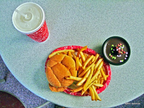 John ordered the Chicken Sandwich. The bread was fresh and soft, the white-meat chicken cutlet was moist, and the breading just enough as not to overwhelm. The fries, well, they were standard fries. But the Triple-Chocolate Cake was rich and moist — a little on the sweet side, but it hit the spot.