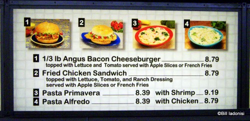 The two previously mentioned pasta dishes, a 1/3 lb. Angus Bacon Cheeseburger ($8.79) and a Fried Chicken Sandwich ($8.79) with choice of apple slices or French fries, give the hungry guest a good choice. Less hungry? Order a Lobster Roll with homemade chips ($9.19) or one of two excellent salads, a Beef and Blue Cheese ($8.39) and a Citrus Shrimp with Mandarin orange dressing ($8.19). And what quick service menu would be complete without Chicken Breast Nuggets ($7.89) — choice again of apple slices or French Fries.