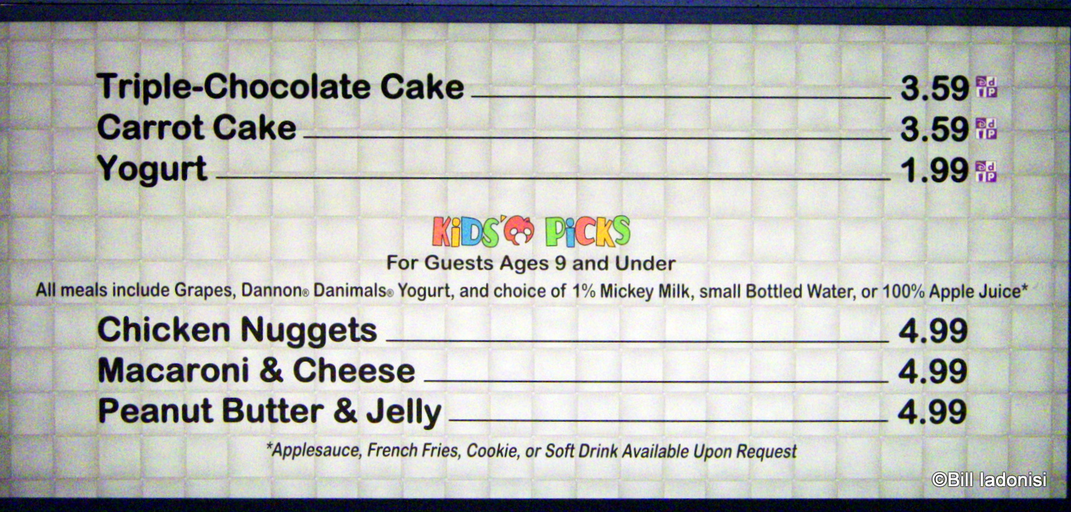 For the kids, Chicken Nuggets, Macaroni and cheese, or Peanut Butter and Jelly is offered. All $4.99, they come with grapes, Dannon Danimals yogurt, and your choice of apple juice, 1% Mickey milk or small bottled water. The kids can also request applesauce, soft drink, French fries or a cookie.