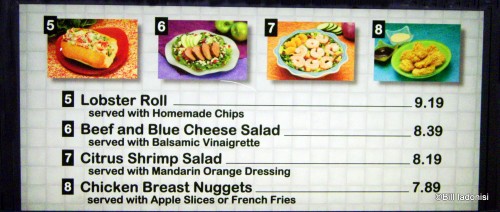 The menu has changed often here. The original dinner menu focused on Asian influenced dishes and offered items like the vegetable noodle bowl with Tofu, Beef and Broccoli with steamed rice; and lunch menu items which were more “Americanized, including burgers, chicken and wraps. A new menu is in effect now, offering Pasta Primavera and Pasta Alfredo, to which you can add shrimp or chicken. Several salads and even a lobster roll are also included on the menu. You can see that Disney is offering a greater selection of healthier items in its eateries.