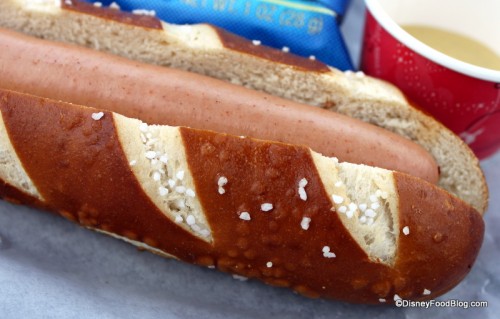Wow, they changed them already? My wife and I ate there a few weeks ago (third weekend of SWW) and had the pretzel roll. That day, it was fully encased by the pretzel bread, just like the menu board. We were given the option, with or without spicy mustard. We went ahead and got with the spicy mustard, which was a mistake. The spicy mustard was already inside the roll with the frankfurter and because they were stored standing on end, all of the mustard had pooled at the bottom. We didn’t realize this until I took a bite and got nothing but spicy mustard.