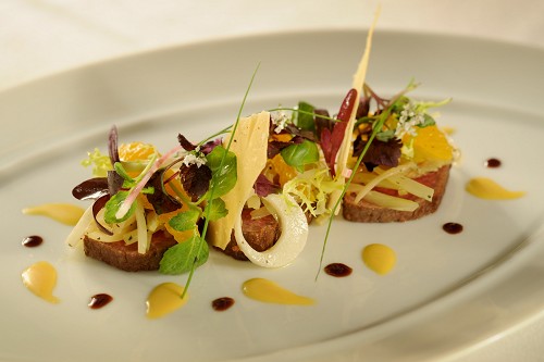Smoked Bison with Melted Fennel and Leeks, Hearts of Palm Salad and Blood Orange-Tangerine Vinaigrette