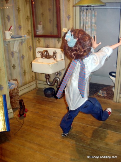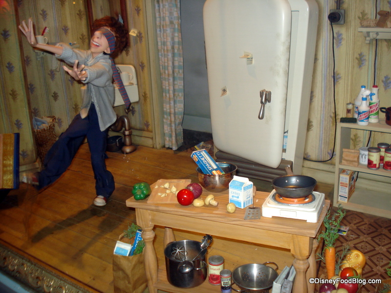 A little, bitty Remy is sitting on Linguini’s head in this shot, and (I wish I’d taken video for you!) Linguini is spinning around wildly throughout the scene.