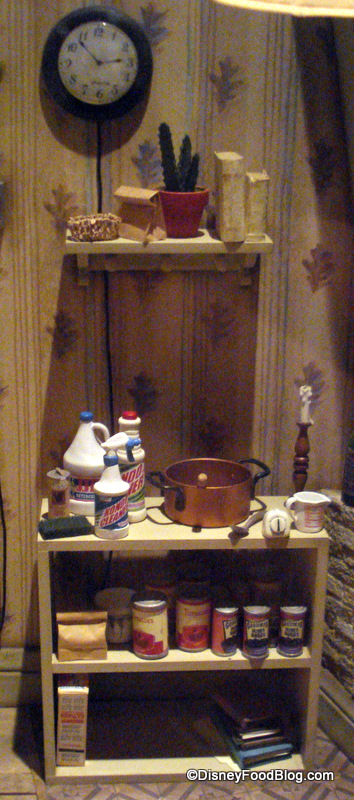 And the storage area toward the back of the scene shows off tiny little cleaning products, a kitchen timer, a house-plant, a melted-down candle, and canned goods.