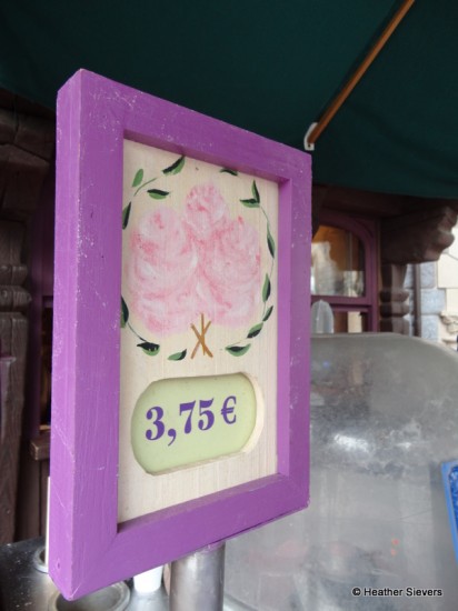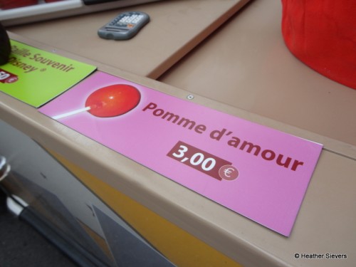 Many of the Ice Cream Stands also had these apples, which to me looked like candied apples. The English sign I saw called them toffee apples and the French one called them Pomme d’ Amour.