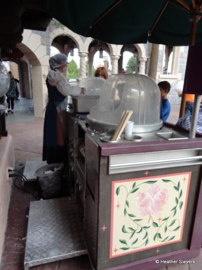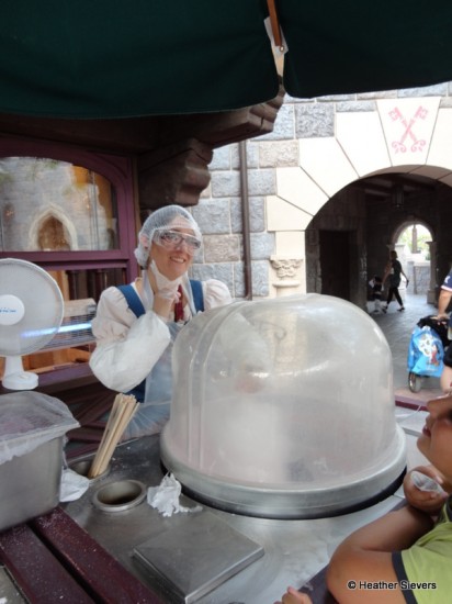 All of these carts were intriguing and looked delicious. The one that really caught my eye, though, was located right inside the entrance of the castle. We’re so used to the bagged or “bucketed” cotton candy, we rarely see it being made fresh to order.