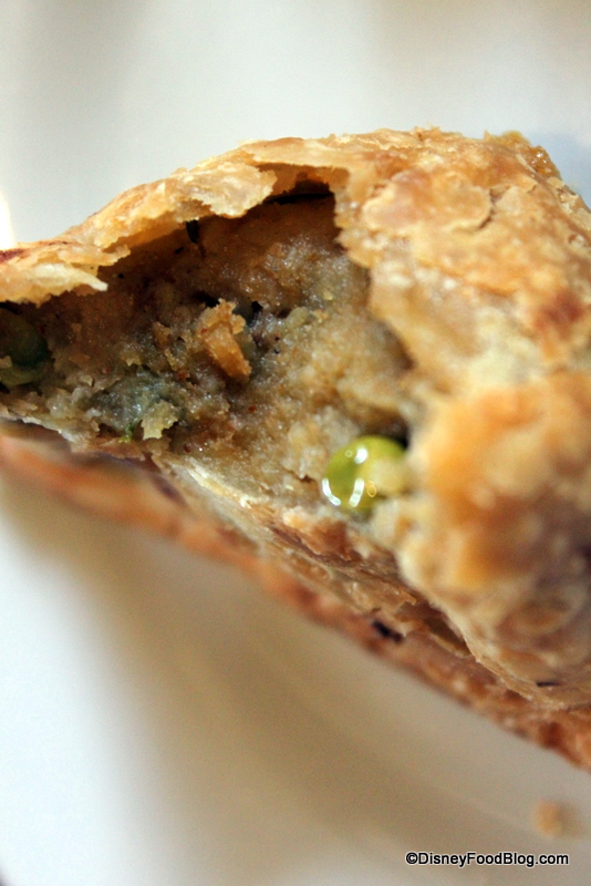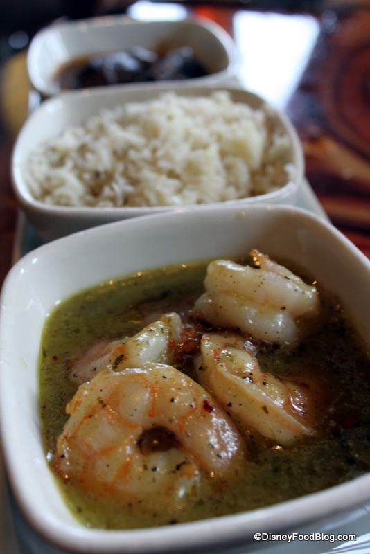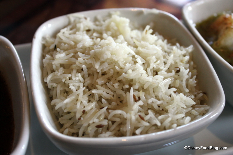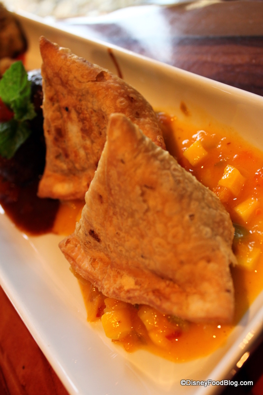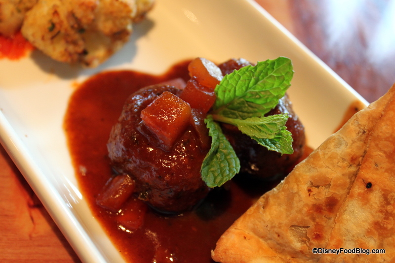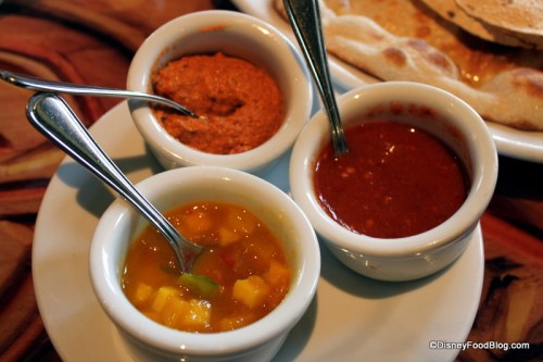 Next up, we tried a dish we had been eagerly anticipating. The Bread Service here offers multiple choices of breads and accompaniments, so we chose Naan, Onion Kulcha, and Paneer Paratha accompanied by Red Chile Sambal, Mango Chutney, and, my husband’s favorite, Roasted Red Bell Pepper Hummus (which you can get over at the Animal Kingdom Lodge’s counter service location, The Mara, as well).