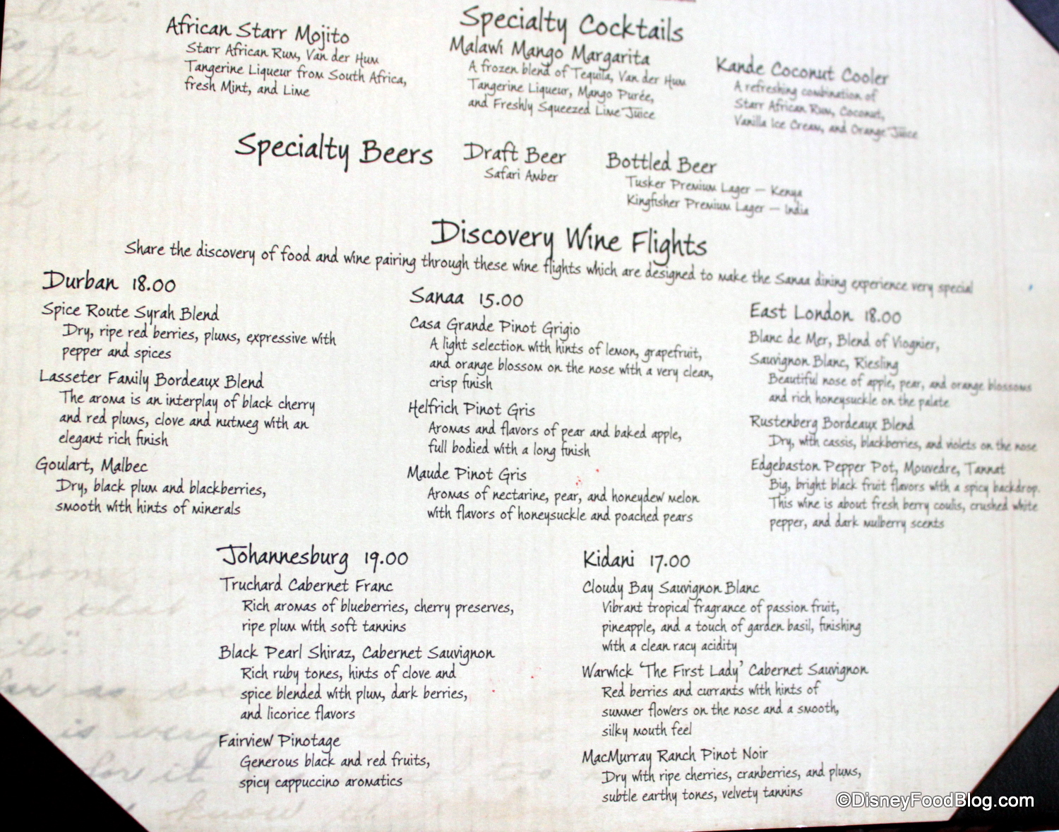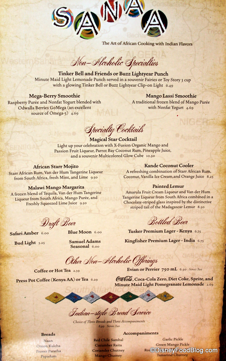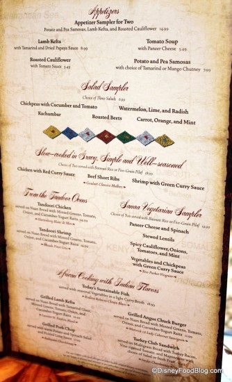 The menu has changed slightly since Sanaa first opened, but it still stays true to the Indian and African inspirations that launched it. Chef Bob Getchell is a master of the cuisine — he’s been working with Indian and African recipes for years and takes a personal interest in bringing new flavors to the guests at Walt Disney World.