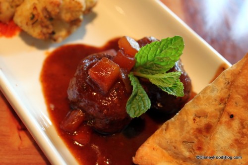 For eats, we started with the Appetizer Sampler for Two, which included Potato and Pea Samosas, Lamb Kefta, and Roasted Cauliflower.