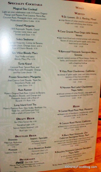 I wish they had left the pictures up in the main dining room, it looks sort of bland to me now since they took them all down and “decorated”. You can almost ALWAYS get a seat here quickly without a ressie though I wish they had some type of sound dampening in there, with tile floors and wood panel walls, it doesn’t take many people to make it sound like a school lunchroom. They also accept Tables in Wonderland (formerly Disney Dining Experience) and you can order drinks from the Gurgling Suitcase in the restaurant.
