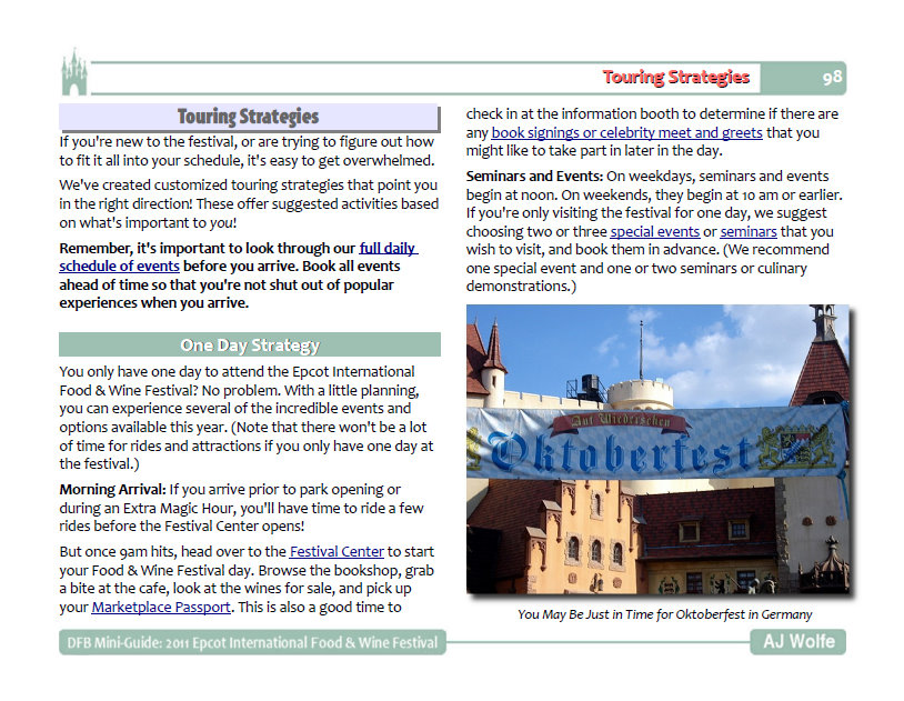 The DFB Mini-Guide to the 2011 Epcot Food & Wine Festival includes bonus items including newly created World showcase marketplace booth crawls, a daily event schedule, an index of all the events, menu items, booths, chefs and more!