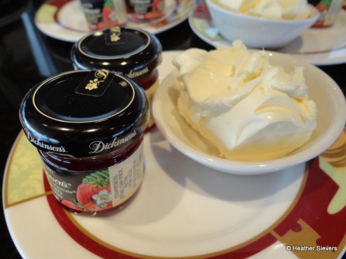 After sandwiches, my absolute favorite thing about high tea came to rest in front of me. Home made scones served warm with Dickinson’s strawberry jam and Devonshire cream.