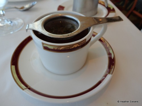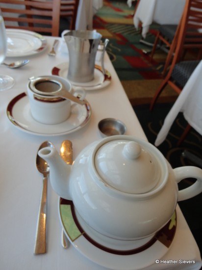 I’m sorry to quibble, because the meal generally looks lovely, but I have to say that I found the tea service to be surprising. Tea is to be brewed in the pot, not the cup. Then as you pour the tea into the cup the strainer catches the loose tea. (If you’ve had tea at the Grand Floridian it is served this way, and at every other tea shop I’ve been to).