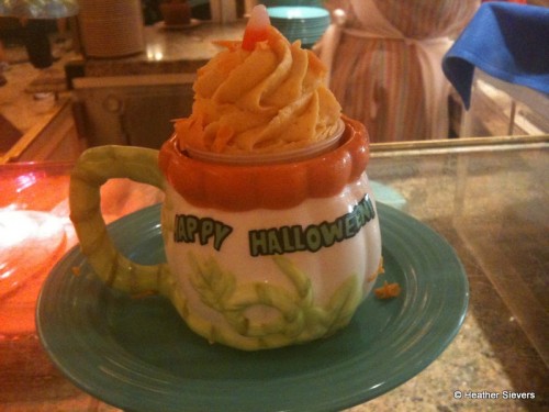 At the Carnation Cafe, you can choose whether or not you’d like to sit down or take your treat to go. Here, they are offering a Hazelnut Tiramisu topped with Pumpkin Spice Mousse served up in an adorable Pumpkin Mickey ceramic mug.