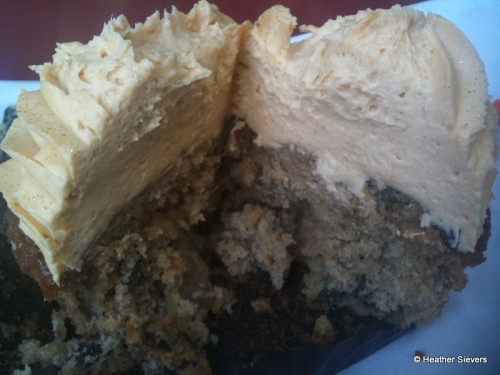 Personally, this item was not my favorite, I’m really not sure why it is marketed as a cupcake, because it is much more like a muffin than a cupcake. I did not taste the caramel or the apple. In fact, to me this tasted like a carrot cake muffin. There were nuts, raisins, and bits of apple in the mix, but really not a whole lot of flavor, that is until you take a bite of it with the Pumpkin Spiced Mousse.