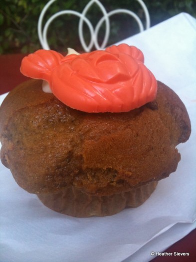 Why, you ask, should you get this here instead of the Blue Ribbon Bakery? I’ll tell you: because here they don’t try to sell this as a cupcake. After I had already eaten mine from the Blue Ribbon Bakery, I went to the Plaza Inn knowing they had the same thing there. What I did not know though was that they do not call it a cupcake. When I asked what the dessert was, the Cast Member said, “It’s a Nutty Caramel Apple MUFFIN topped with Pumpkin Mousse.”
