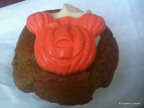 At the Blue Ribbon Bakery you’ve got a few options to choose from, OR get them all! Here you’ll find my top favorite pumpkin snack item. The Pumpkin Muffin. For just $2.99, you can sink your teeth into a moist, delicious muffin that really tastes more like cake. The muffin is quite big — plenty big enough to share. It’s topped with a dollop of cream cheese frosting and an orange-colored chocolate Mickey pumpkin.