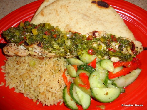 I had the chicken skewer with chimichurri sauce as well and found it to be pretty much as you described. Moist chicken, sauce was nice, like you said…not over powering at all. I did not care for the rice however. It had an odd taste to it that I didn’t like. The pita bread was very good-soft, warm and fresh. My son had the kids chicken skewers. That comes with 3 chicken breast kebobs, rice and tzatkini sauce. Unlike my chicken, this chicken was dry as a bone and very bland, no seasoning. The yogurt wasn’t good either. We make this at home so I thought he would like it. Whatever they did to it, it didn’t taste right. All in all, I would eat there again but would head next door for the flatbread pizza for the kiddo.