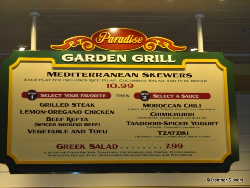 I love the Paradise Garden Grill. The meat skewers we tried were all juicy and flavorful. I also really enjoyed the cucumber salad and warm pita. Even the rice, which I’m not normally that fond of, had nice flavor and wasn’t bland or overcooked. In terms of the taste and quality, I feel the selections at the Paradise Garden Grill are superior to the offerings at the neighboring Boardwalk Pasta & Pizza. Flatbread pizzas and mediocre pasta? Been there done that. I hope guests will come to discover and love the mediterranean flavors at the Paradise Garden Grill. And here’s a tip: you can ask for *all 4* sauces on the side with your skewer so you can try them all!