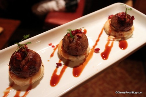 For appetizers, we ordered the duck meatballs and the poutine. The meatballs were one of the few menu items we hadn’t yet sampled, so we figured it was time to dive in! (Plus, my trip had been very duck-centric thus far, so we thought it was fitting.)