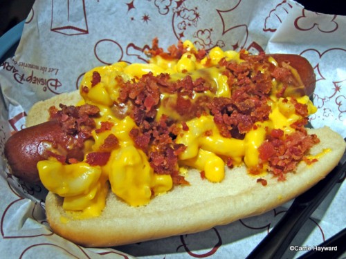 Definitely the most talked-about special menu item, this diet-busting snack featured one of Disneyland’s new larger — and reportedly more flavorful hot dogs — smothered in neon macaroni & cheese and topped with bacon bits.