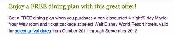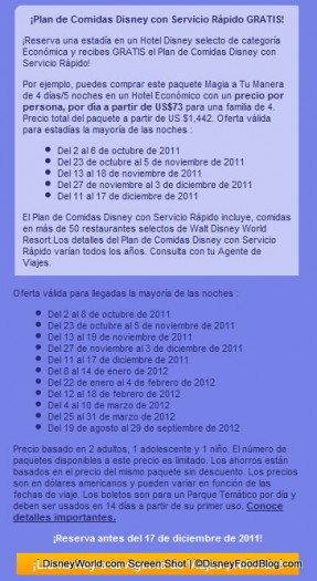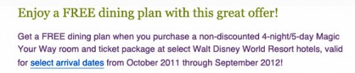 Thanks to Laura for the fun tip that guests booking from Latin America now have the option to choose a Disney World Free Dining package through September 2012!