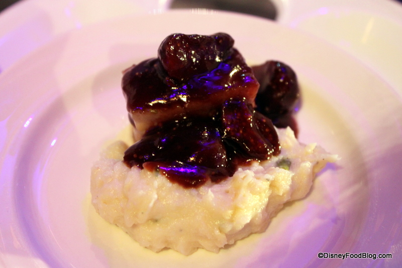 From here, I headed over to the sign that said both “PORK BELLY” and “GORGONZOLA.” Those are two foods I like very much, and I was intrigued to try them together. The Braised Pork Belly served over Gorgonzola and Chive Yukon Gold and Parsnip Mash Accompanied by Fig and Amarone was created by Chef Javier Pareja of Disney’s Yacht and Beach Club.