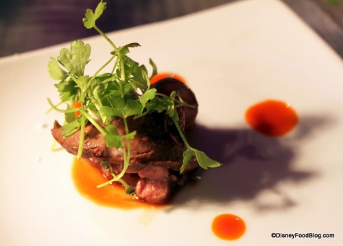 Finally, this trip to WDW had been peppered with duck dishes, so I had to try the Motswako wa Sehudi Five Spice Duck Breast with Crispy Rind Crackling from Chef Sutilak Martin of Boma in Disney’s Animal Kingdom Lodge. This was a delicious dish, but I didn’t hear any crackling. 😉