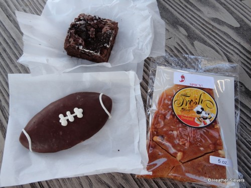 After browsing the window, which was full of caramel apples, cookies, and a few other choice treats, we decided on a random quartet of Oreo Brownie, a football cookie, Spicy Peanut Brittle and a Chocolate Dipped Fruit Skewer.