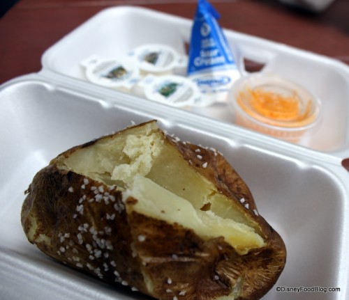 The potato sells for $3.49, and comes with cheese, butter, and sour cream (none of which come on top of the potato, so you don’t have to use them). This snack can be purchased with a Disney Dining Plan snack credit.