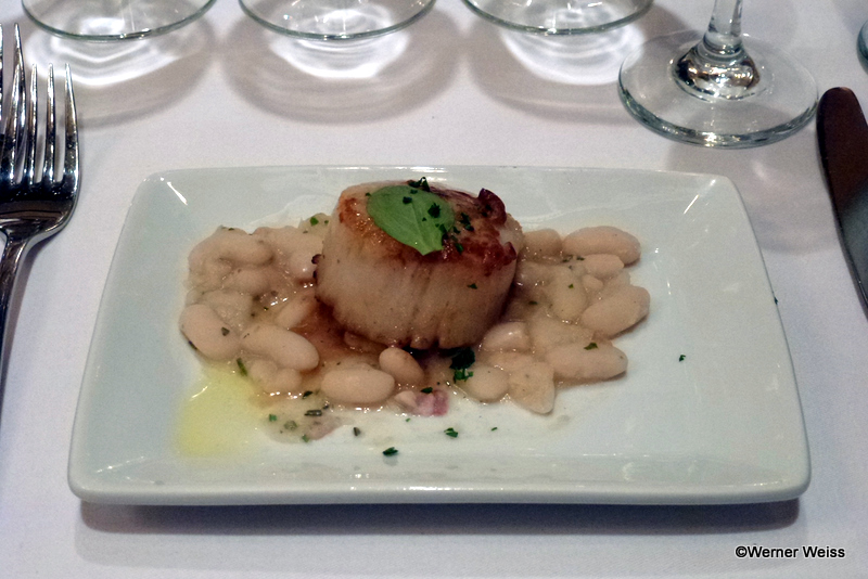 Capesante e Cannellini Scallops, Cannellini beans, Pancetta, Rosemary, Tuscan olive oil paired with Prosecco, Bosco del Merlo