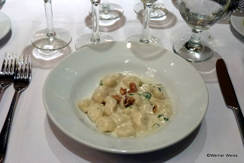 Gnocchi al Gorgonzola e Noci Potato dumplings, Walnuts, Arugula, Gorgonzola cheese sauce paired with Pinot Grigio, Paladin