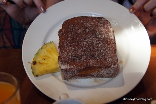 The eggs were okay, the same you would find at any other Disney restaurant. The pancakes were silver dollar and were topped with pineapple and macadamia nuts. While the pancakes themselves were nothing to write home about, the topping was what made them special. The mix of flavors between the sweetness of the pineapple and the saltiness of the macadamia nuts really worked well together.