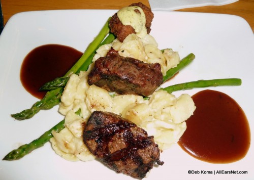 Thanks to Deb Koma from AllEars.net who told me about the crawfish beignets over at Boatwrights at Disney’s Port Orleans Resort Riverside! These accompany the grilled tenderloin medallions, which are also served with “mac and cheese.” Deb gives them a thumbs up!