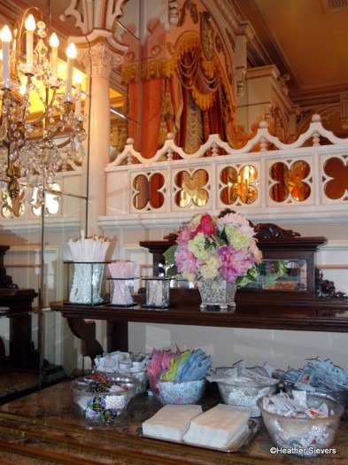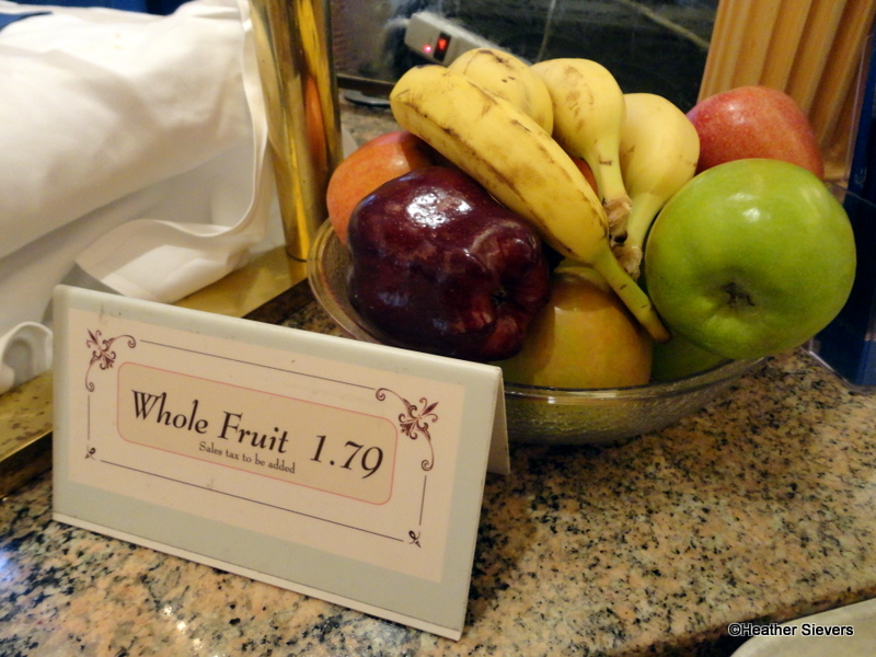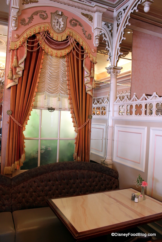 Guests are greeted at the door by a large buffet and an ornate dining room full of velvet curtains, crystal chandeliers, and the kind of opulence you’re not used to seeing at a counter-service location!