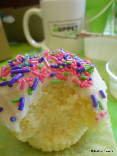 I quickly spread my frosting, sprinkled my sprinkles and dug in. The cupcake was moist and the frosting was perfection. My only suggestion? I think it would have been super fun to make the decorating “Muppet” themed. Maybe green frosting and Kermit eyes? Just a thought.